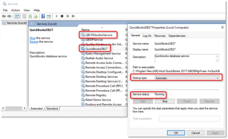Open the “Run” dialogue by pressing Win + R, type services.msc, and press Enter. Find the QuickBooksDBXX service (XX denotes the version number) and initiate the service restart.